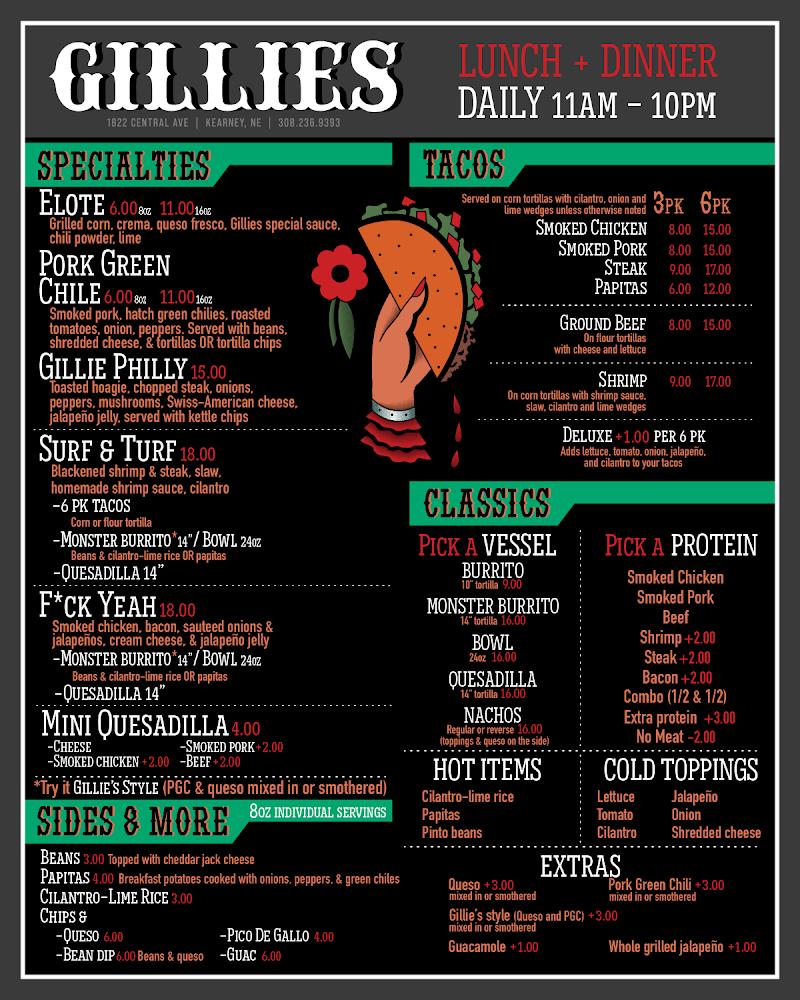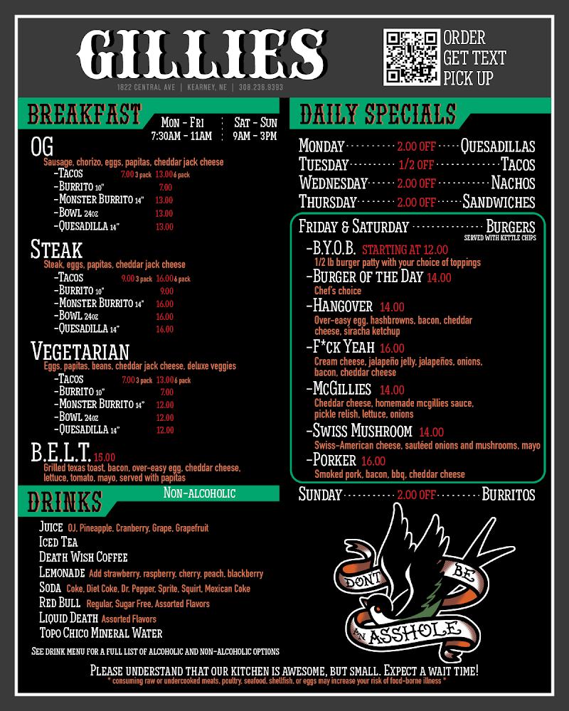 Welcome to Gillies, your go-to destination in Kearney for a vibrant food and drink experience! With over 40 craft beers and an enticing array of craft cocktails, there's something to please every palate. Our welcoming atmosphere features a beer garden, pool, and darts, perfect for unwinding with friends. Enjoy delicious meals from our kitchen, open daily until 10pm, paired with unbeatable happy hour specials. We're open from 7am to 1am on weekdays and 9am to 1am on weekends, ensuring you have ample time to savor breakfast, lunch, or dinner. Join us at 1822 Central Ave for an unforgettable experience!