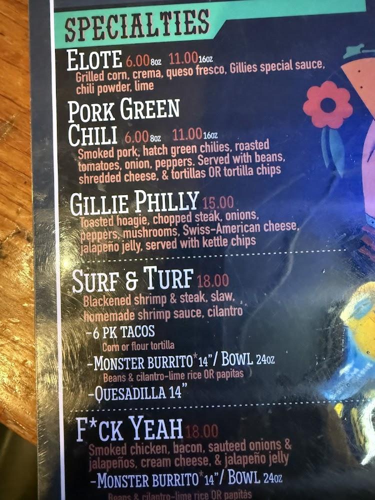 The menu at Gillies features a mix of classic and contemporary dishes. Breakfast selections include burritos and hearty breakfasts. Lunch showcases burgers, including the Wagyu Black Truffle burger, a regular favorite. Taco Tuesday offers delicious options at a great price.